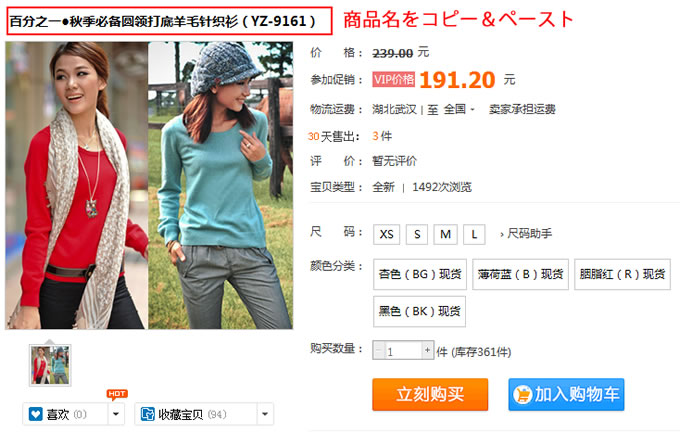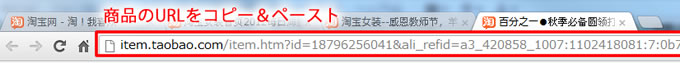 購入希望商品画面の最上段左側の「http」から始まるURLと商品名をコピー&ペーストして、色、サイズ、数量など正しくご記入の上、送信してください。
